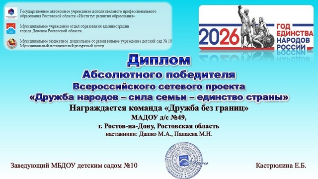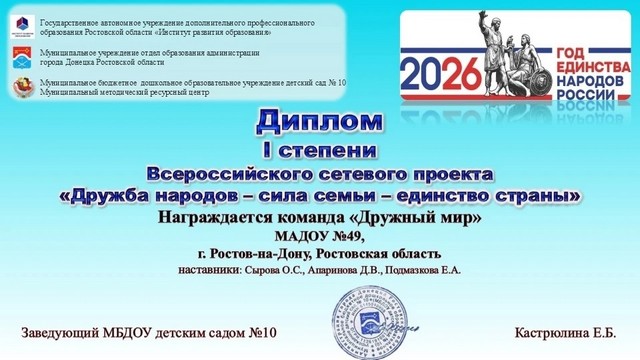 Воспитанники подготовительной группы № 8 стали абсолютными победителями и воспитанники подготовительной группы № 18 МАДОУ № 49 (1 и 2) - победителями Всероссийского сетевого проекта «Дружба народов — сила семьи — единство страны», который проходит при поддержке ГАУ ДПО РО "Институт развития образования". Организатором выступает муниципальный методический ресурсный центр, МБДОУ № 10 (г. Донецк Ростовской области).